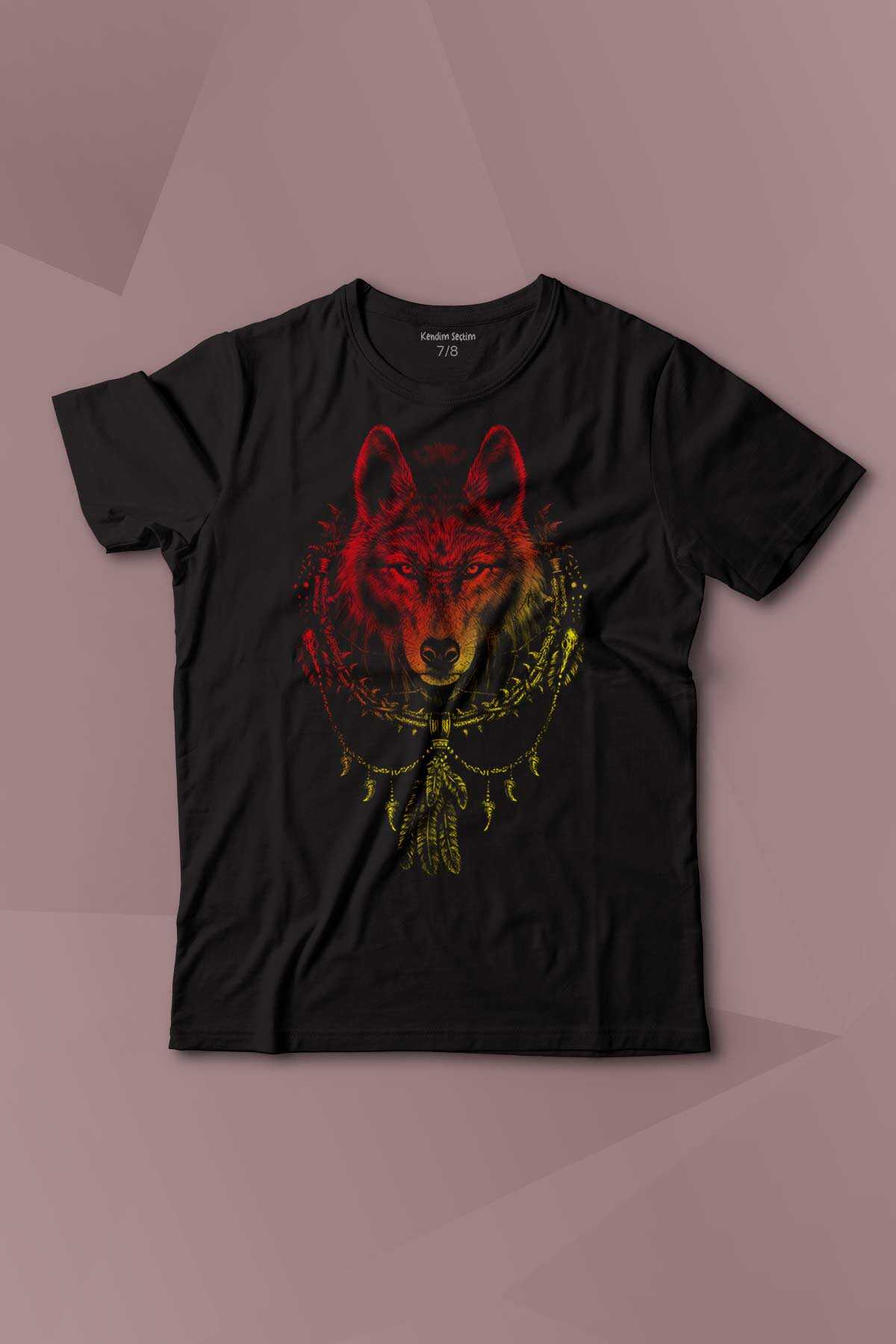 | Bozkurt Kurt Kafası Wolf Sarı Kırmızı Baskılı Çocuk Tişört Kısa Kollu |