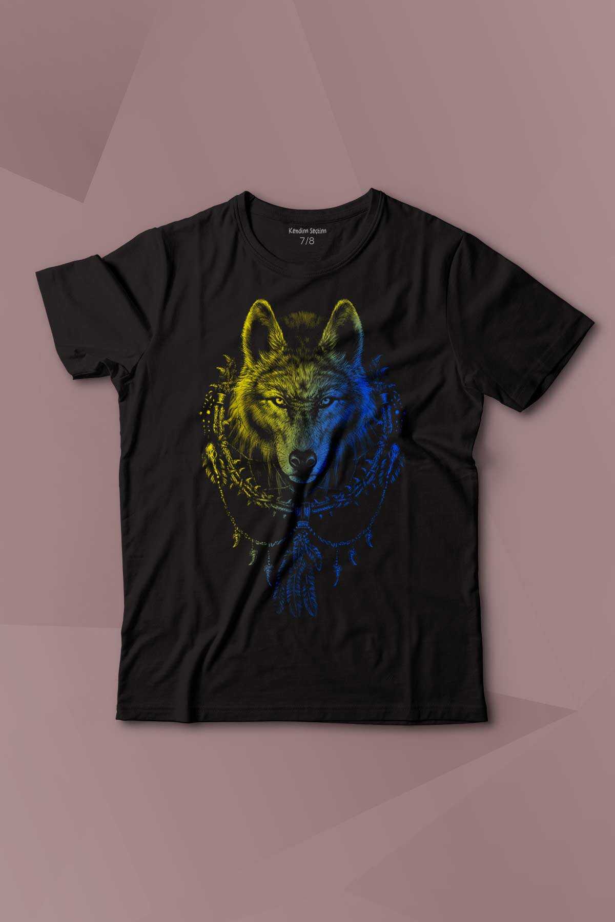 | Bozkurt Kurt Kafası Wolf Sarı Lacivert Baskılı Çocuk Tişört Kısa Kollu |