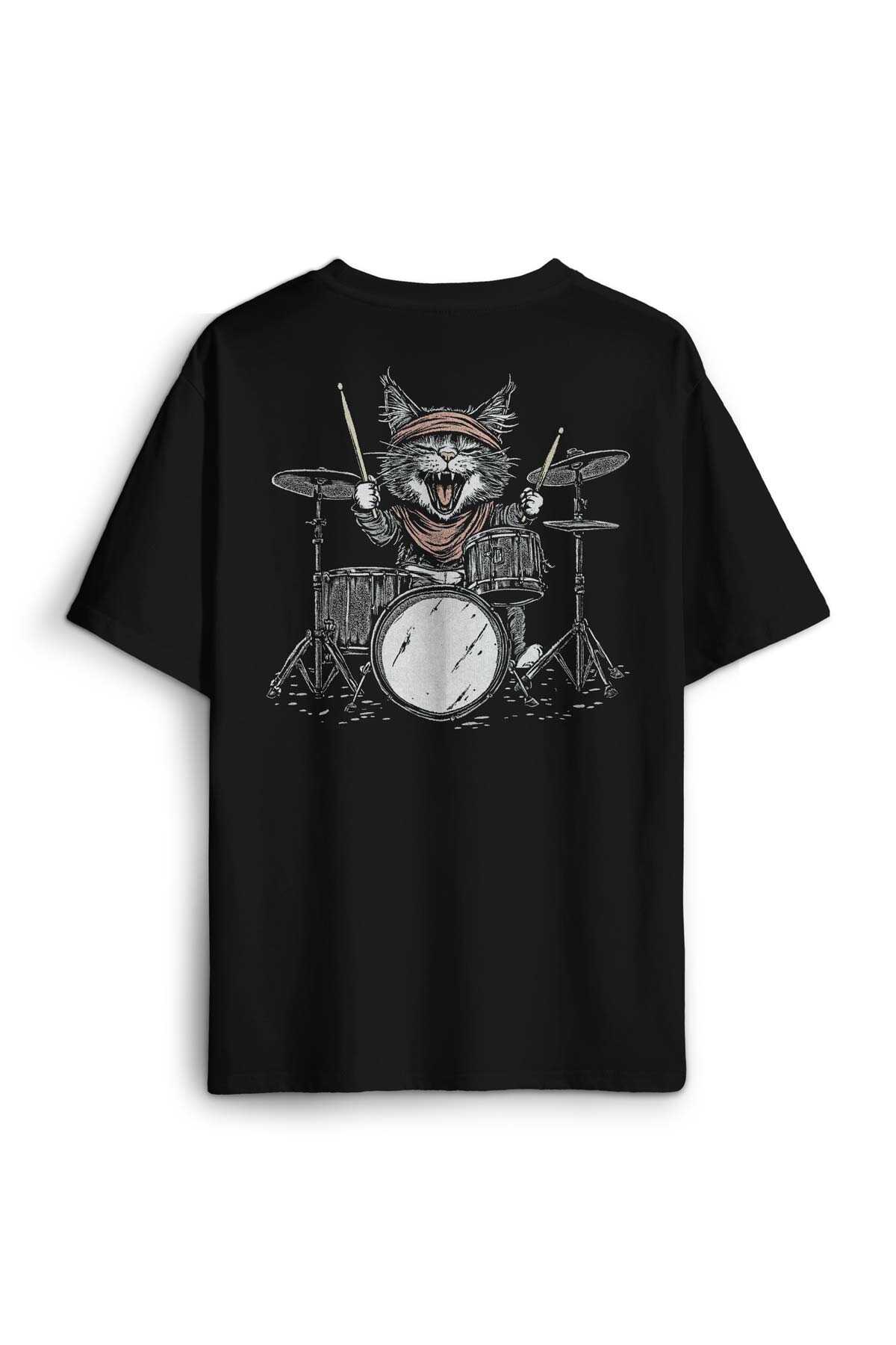 - Drummer Cat Kedi Davulcu Müzik Music Drum Cute Baskılı Oversize T-shirt Siyah Unisex Tişört - OVR12S-4438