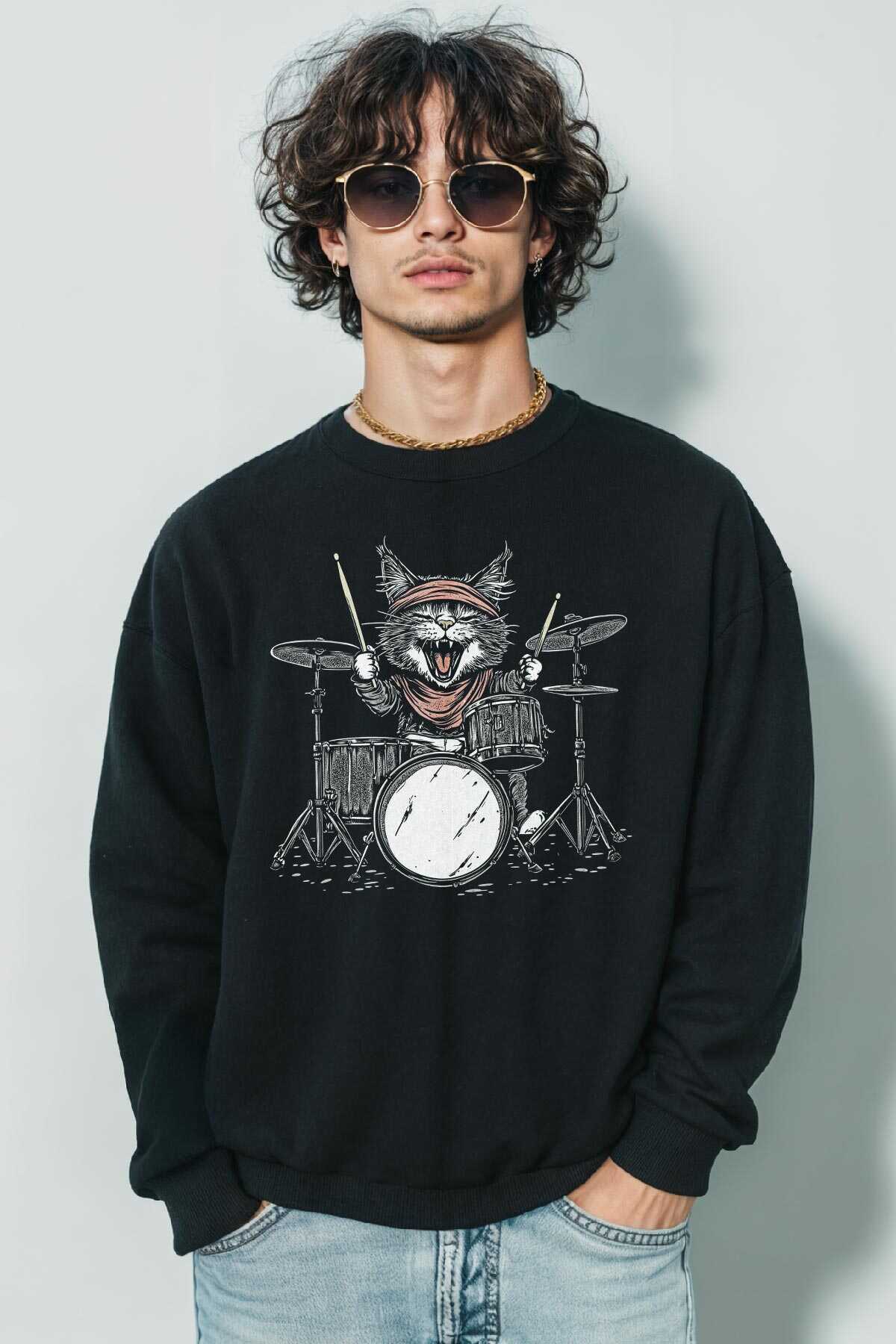 Drummer Cat Kedi Davulcu Müzik Music Drum Cute Baskılı Siyah Sweat