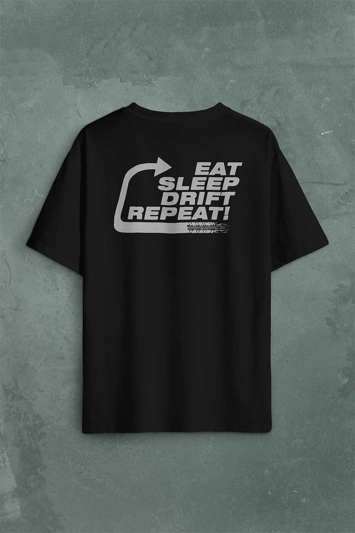 Eat Sleep Drift Repeat Race Sport Motospor Sırt Ön Baskılı Oversize Tişört Unisex T-Shirt