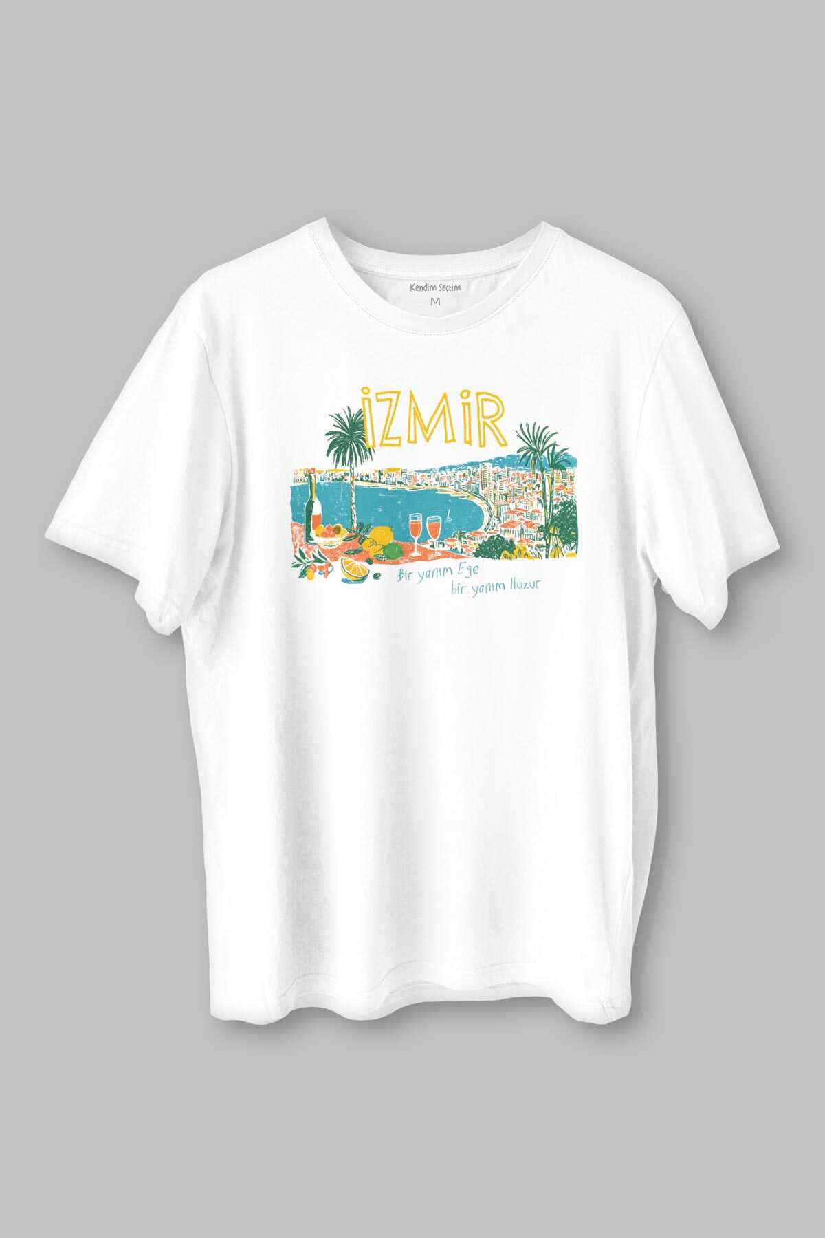 İzmir Tişört Ege Ruhu Limon Zeytin Şehir Baskılı Beyaz T-shirt