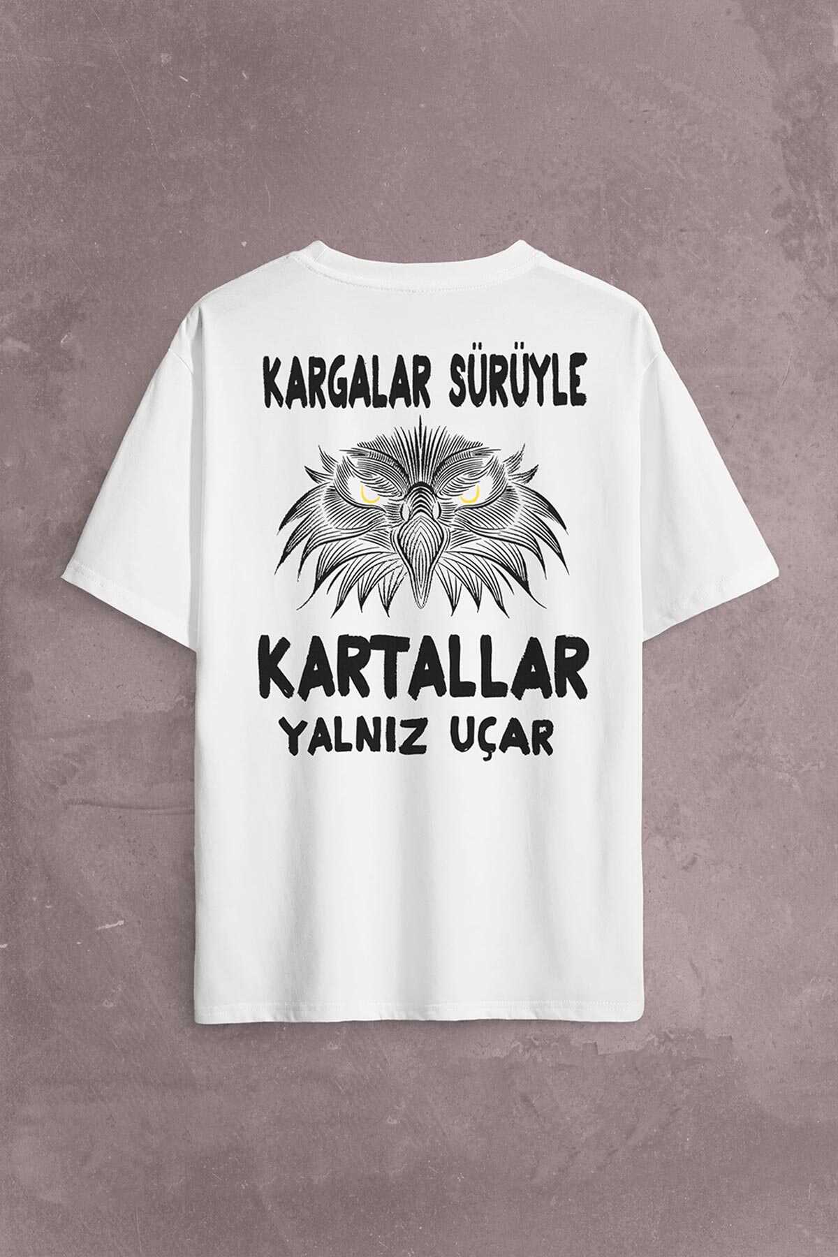 White Oversize T-shirt Eagle Kartallar Yalnız Uçar Sırt Ön Baskılı Tişört Unisex T-Shirt
