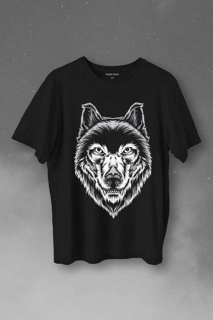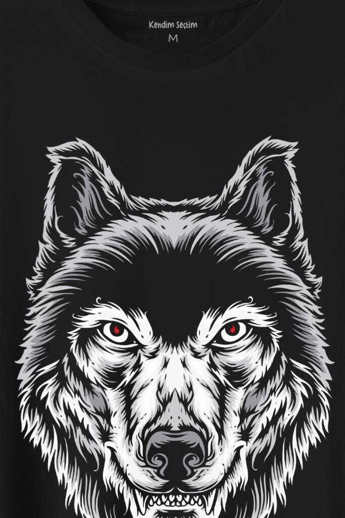 Kırmızı Gözlü Vahşi Kurt Kafası Wolf Head Bozkurt Baskılı Tişört Unisex T-Shirt