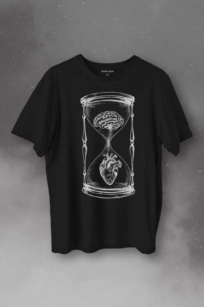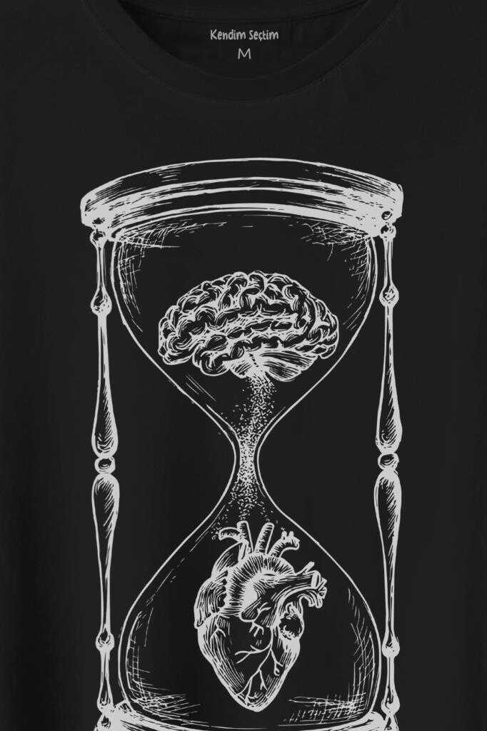 Kum Saati Kalp Beyin Aşk Mantık Baskılı Tişört Unisex T-Shirt