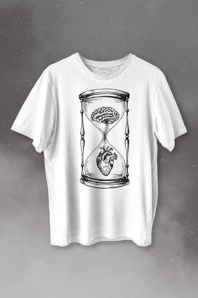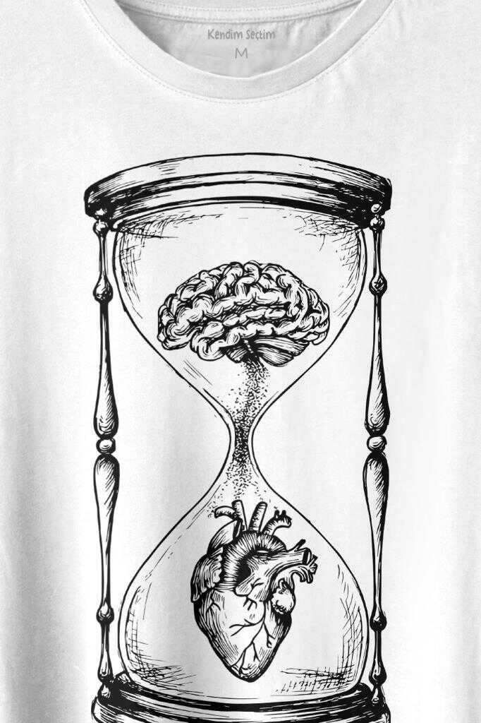 Kum Saati Kalp Beyin Aşk Mantık Baskılı Tişört Unisex T-shirt