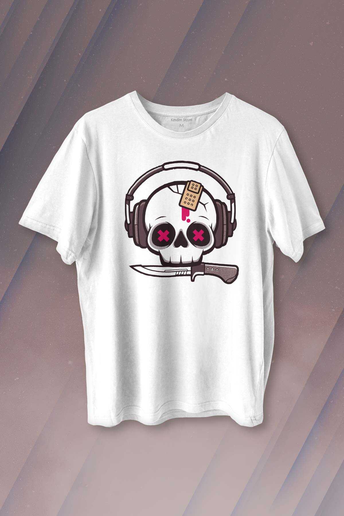 Müzik Dinleyen Kuru Kafa Kulaklık Bıçak Yara Bandı Skull Baskılı Tişört Unisex T-shirt