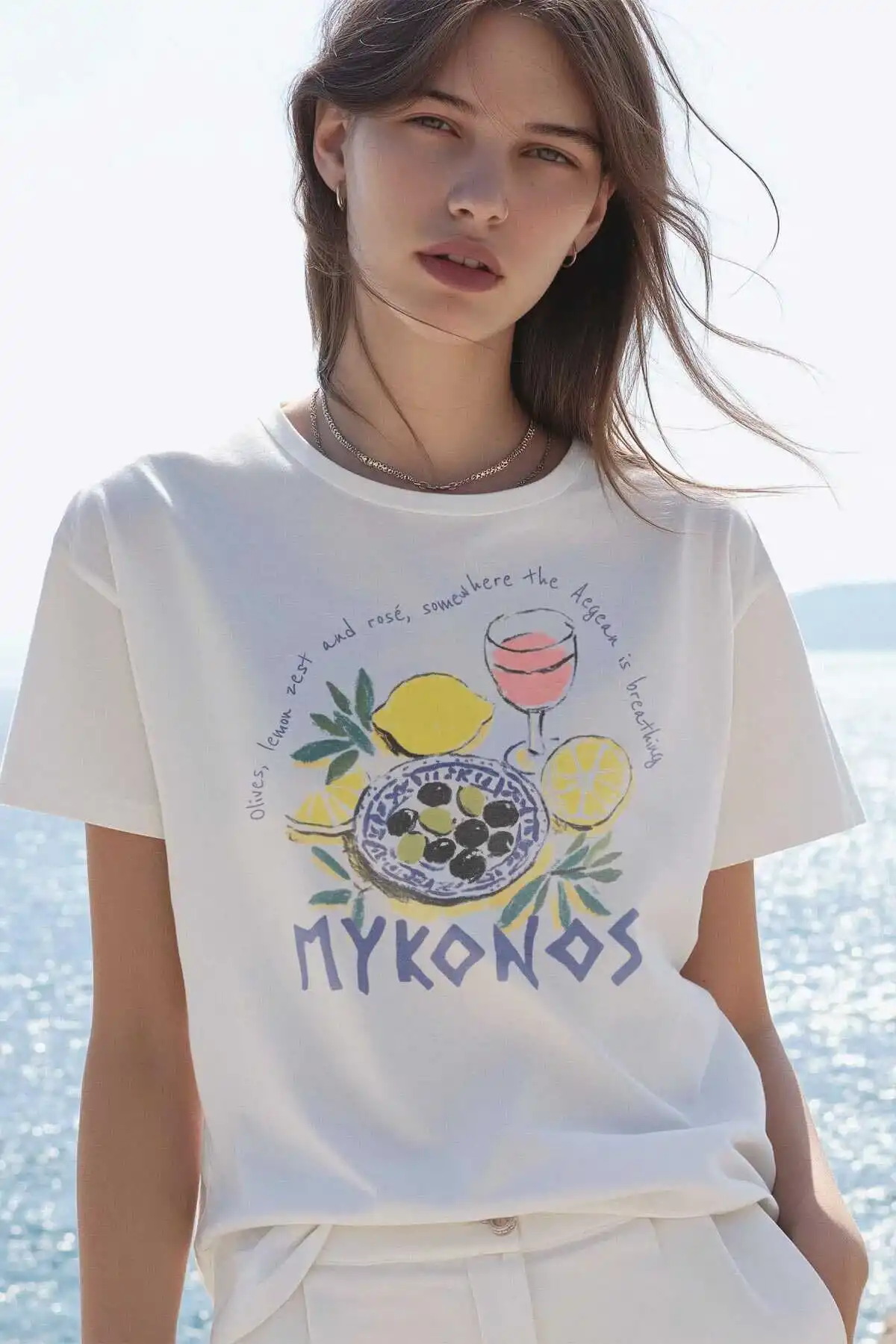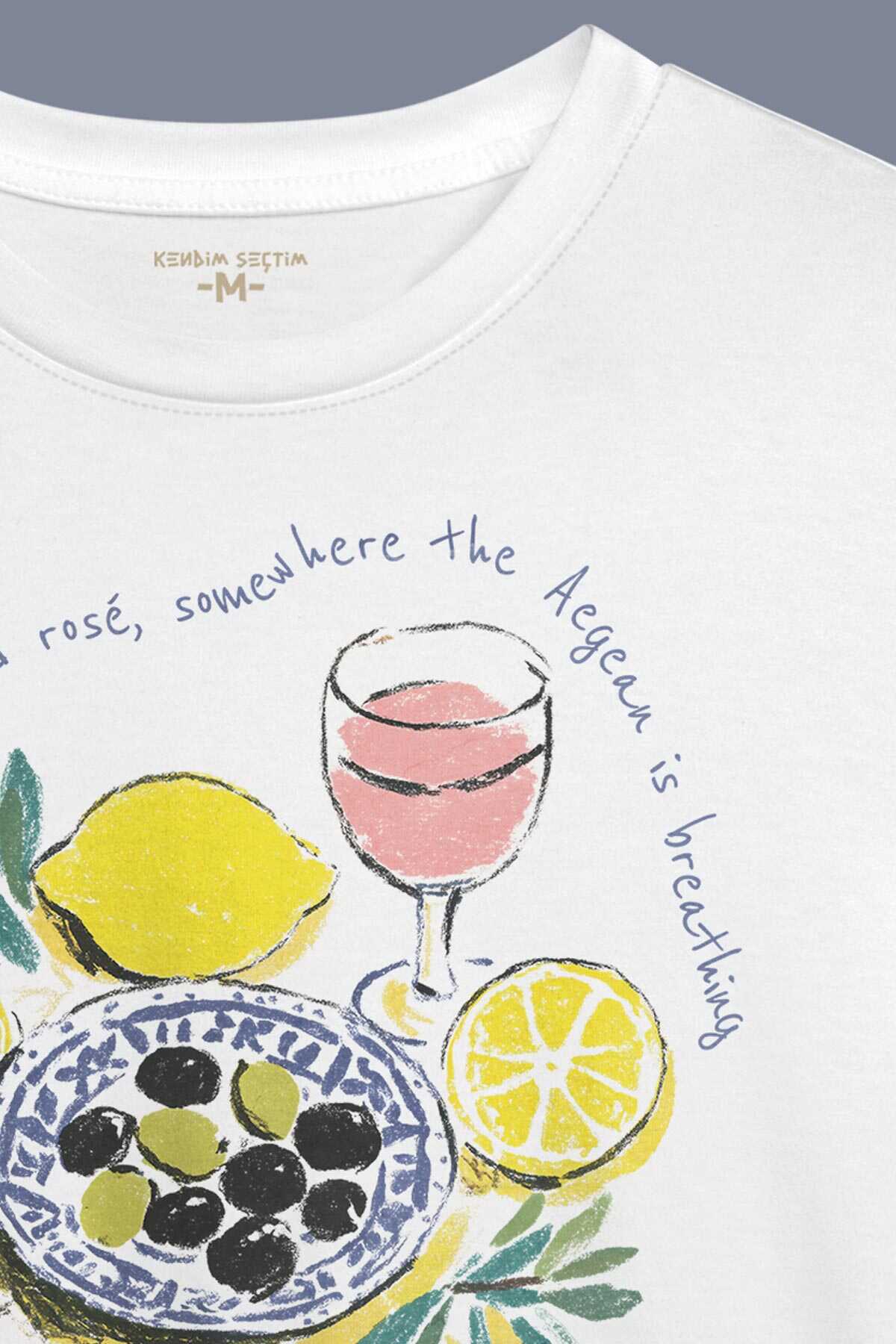 Mykonos Limon Rose Wine Olive Baskılı Summer T-shirt Yaz Mikanos Beyaz Tişört
