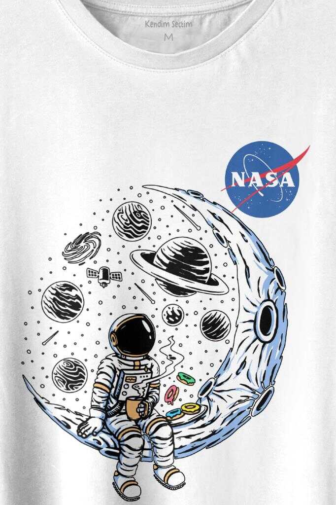Nasa Logolu Ay Ayda Donut Yiyen Astronot Drinkin Coffee Baskılı Tişört Unisex T-shirt