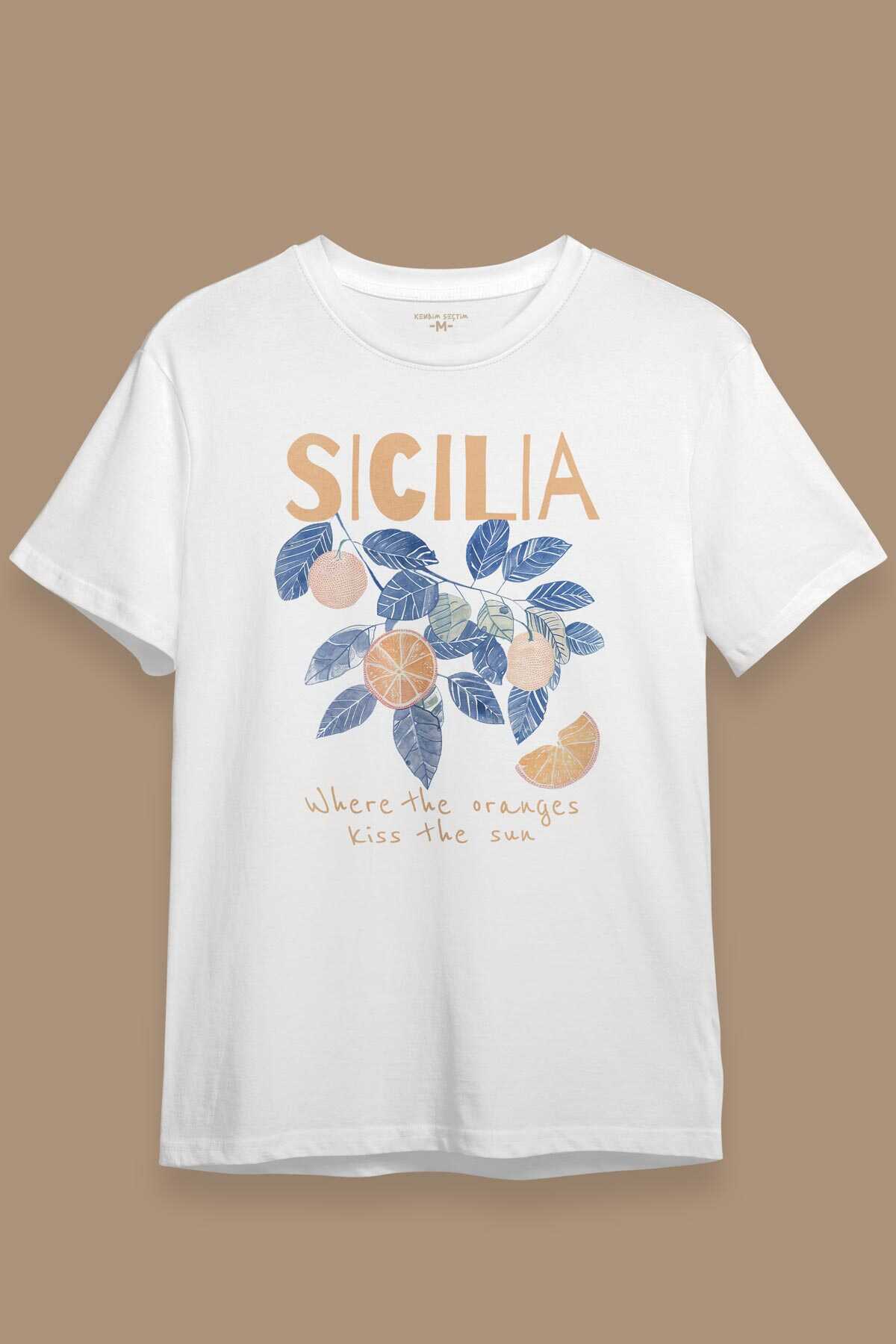 Oranges Kiss The Sun Sicilia Italy İtalya Sicilya Meyve Portakal Baskılı Unisex Beyaz T-shirt