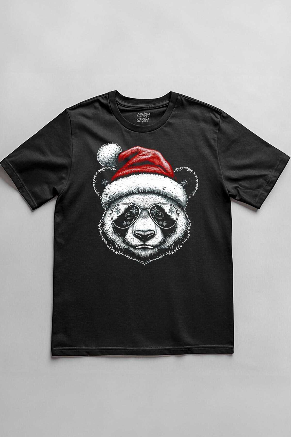 Panda Santa Noel Şapkası Funny New Year Yeni Yıl Yılbaşı Baskılı T-shirt Unisex Tişört - T01S4429