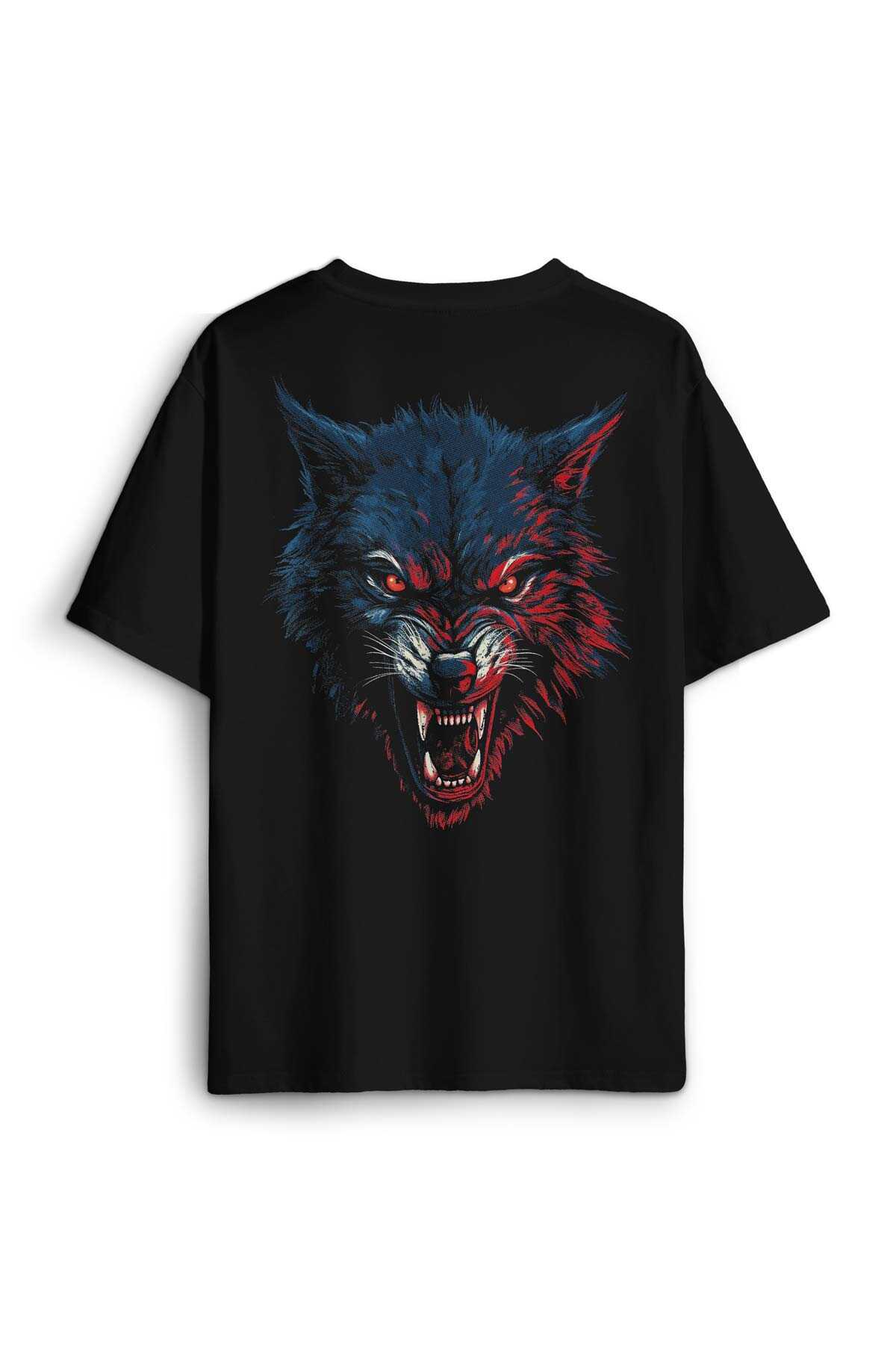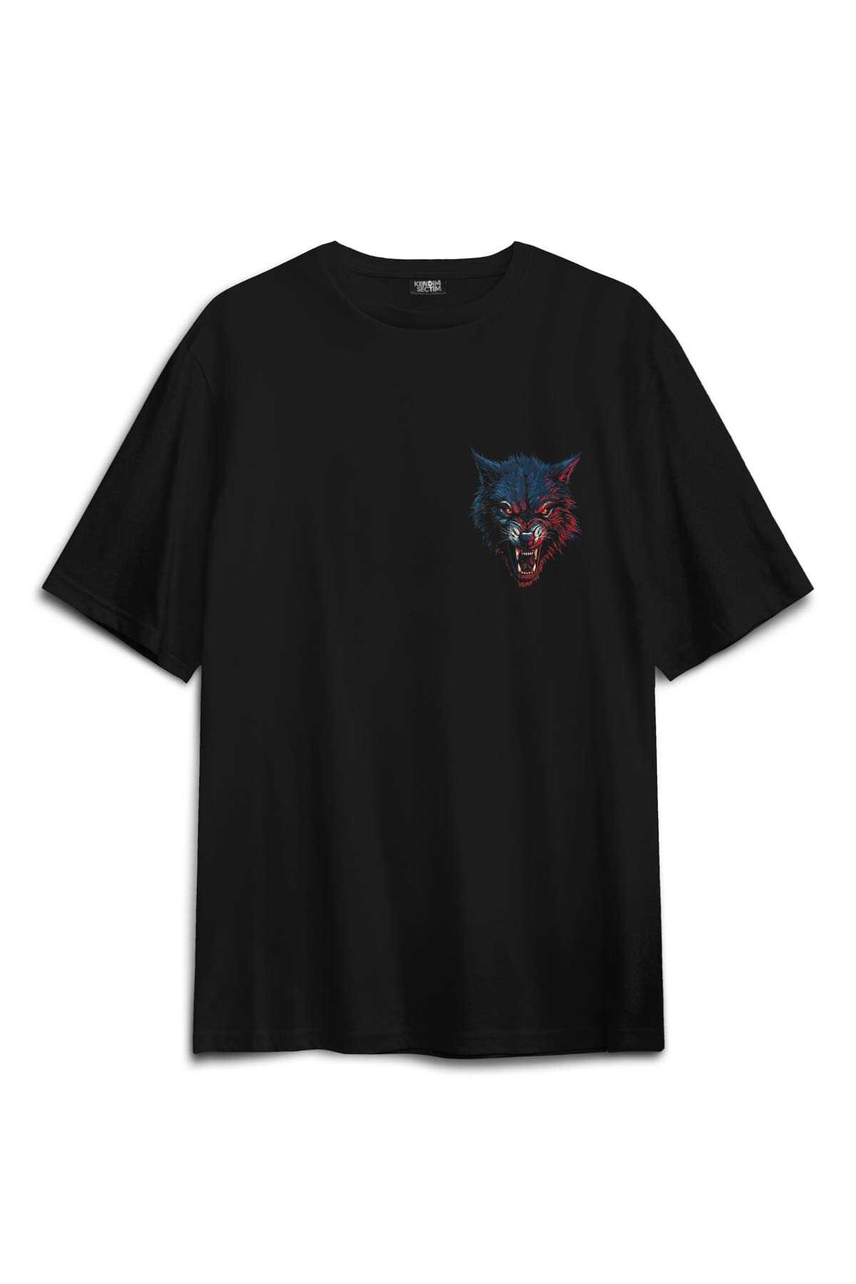 Siyah Oversize Tişört Bordo Mavi Kurt Wolf Red Blue Sırt Ön Baskılı Unisex T-shirt