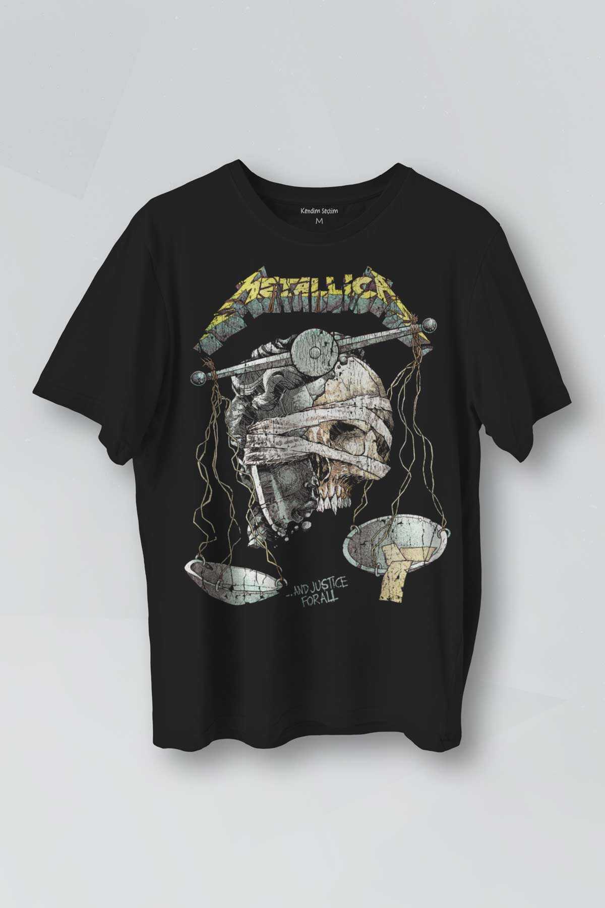 Albüm kapağındaki o ikonik, ipleri kopmuş ve çatlamış Adalet Heykeli figürü, kelimelerin yetersiz kaldığı yerde başlayan görsel bir manifestodur. Heavy Metal’in o sert ritimlerinin zihinde yarattığı etki, bu tasarımda somutlaşır. Her çizgi, Hetfield’ın sert vokallerinden ve Ulrich’in ritimlerinden süzülüp kumaşa mühürlenmiş gibidir.