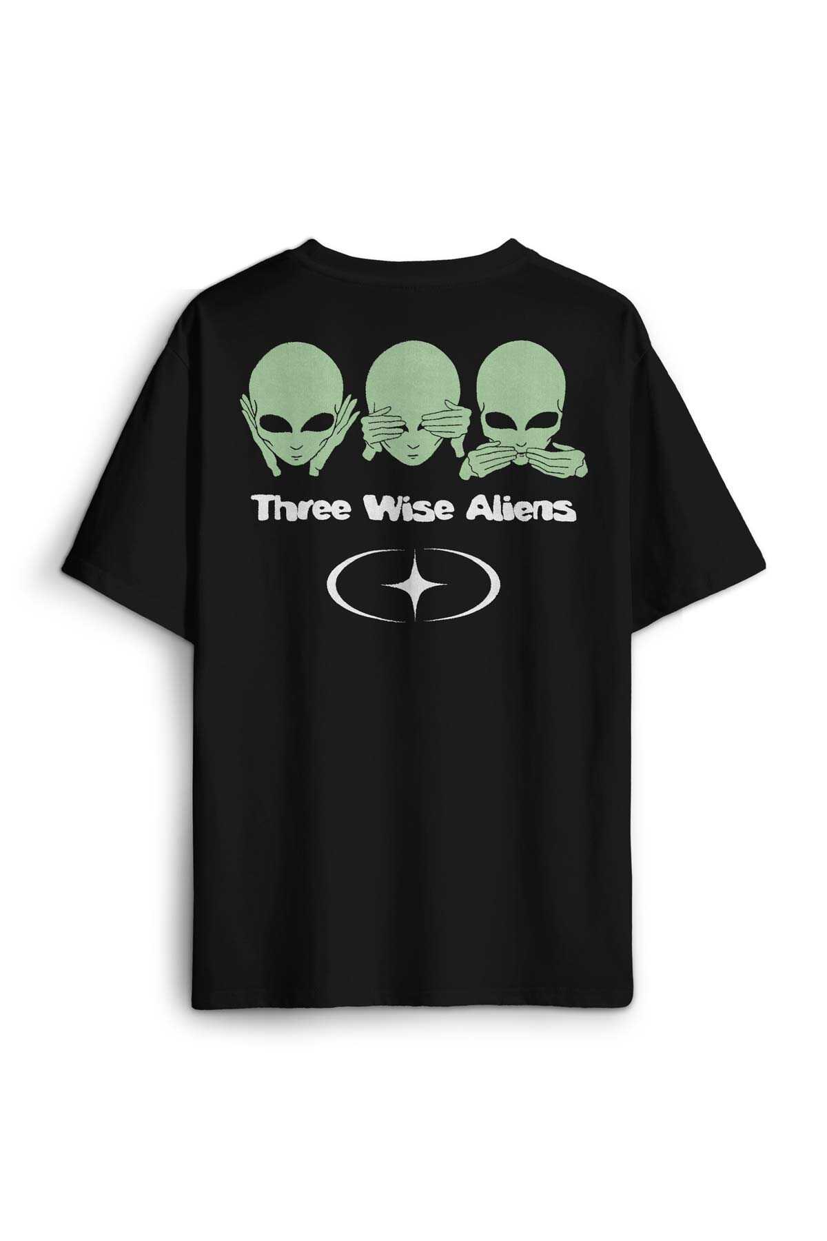 - OVR12S-4423 - Siyah Tişört Three Wise Aliens Ufo Mars Uzay Kozmos Minimal Baskılı Oversize T-shirt