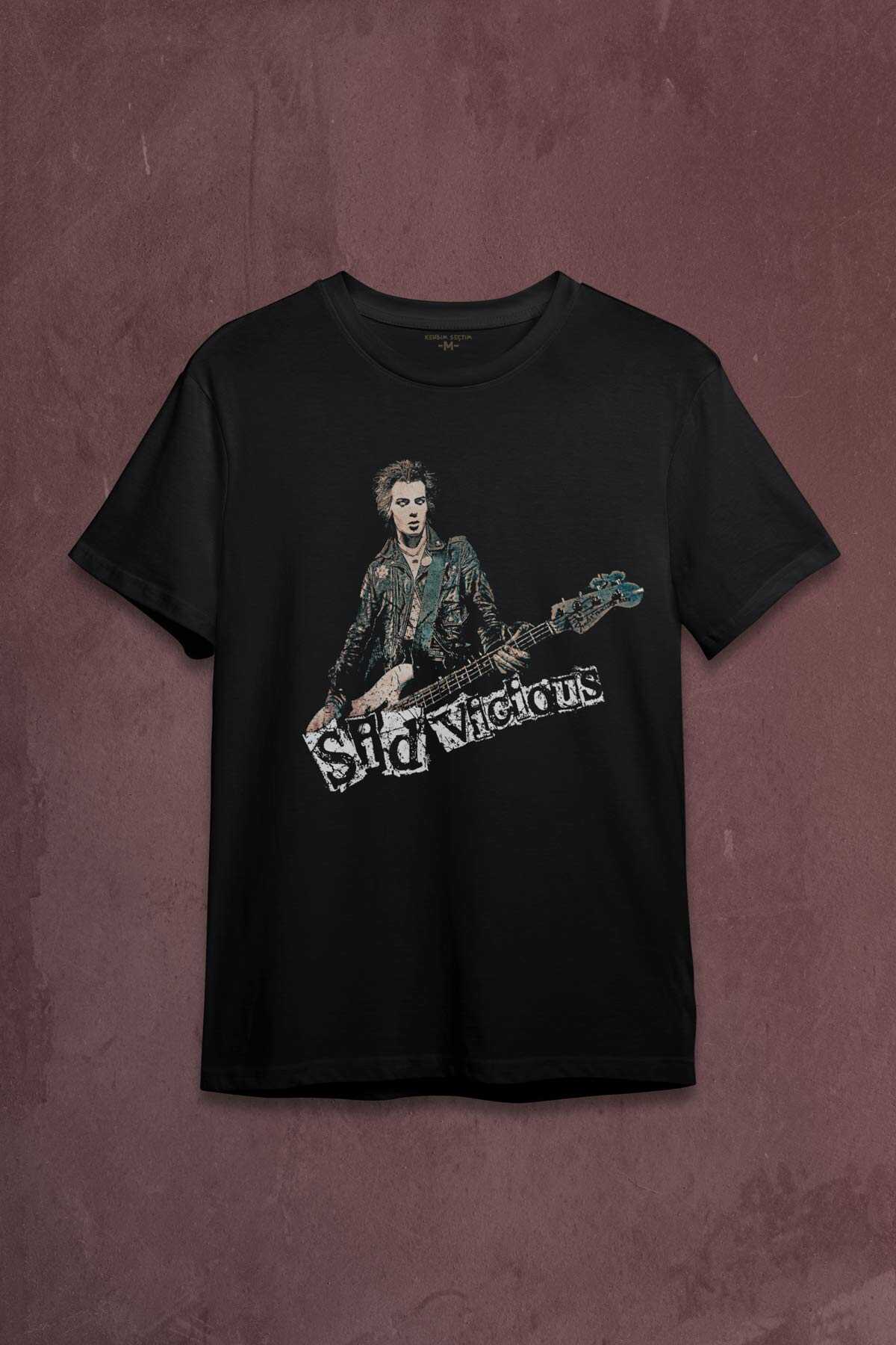 Siyah Unisex Tshirt Sid Vicious Sex Pistols Bass Guitar Music Punk Baskili Tisort