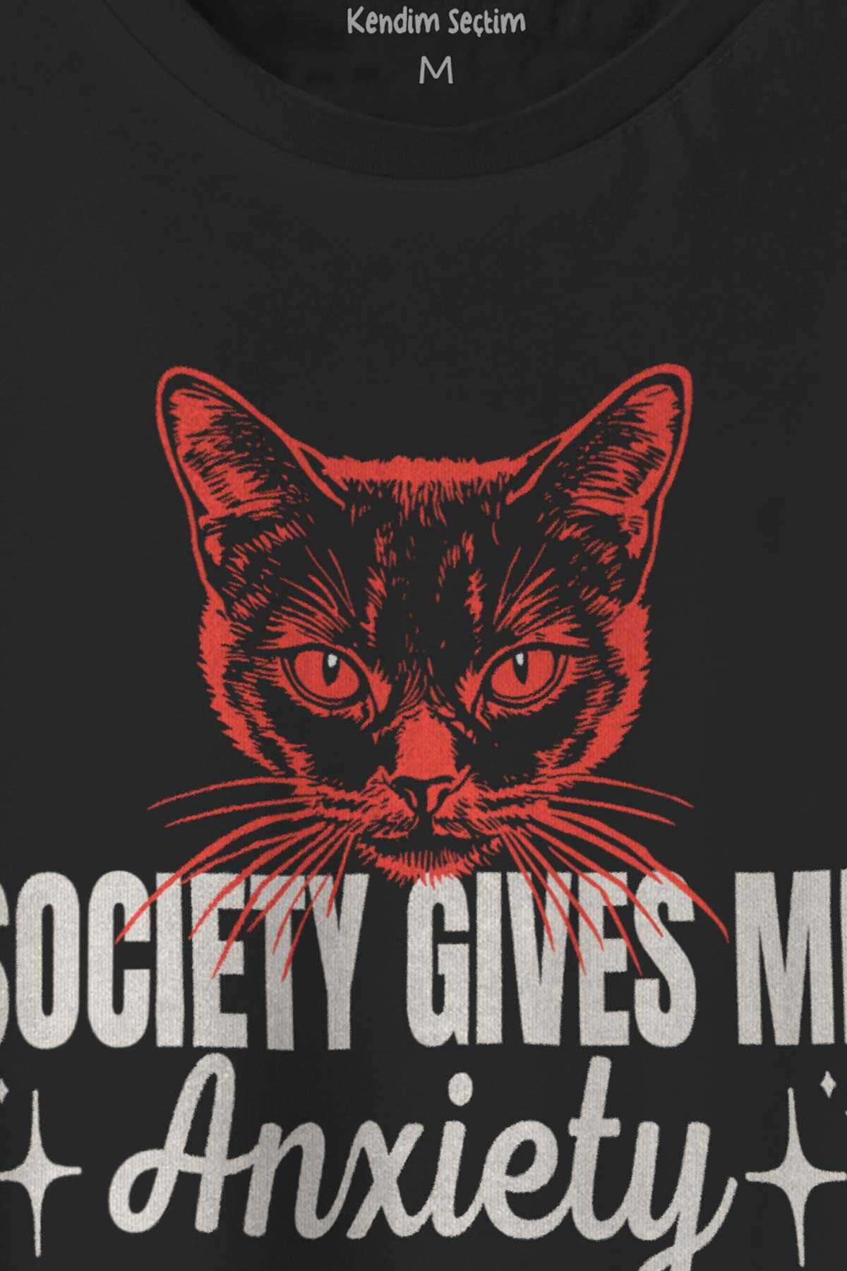 Society Gives Me Anxiety Sosyal Anksiyete Kedi Cat Baskılı Tişört Unisex Siyah T-shirt