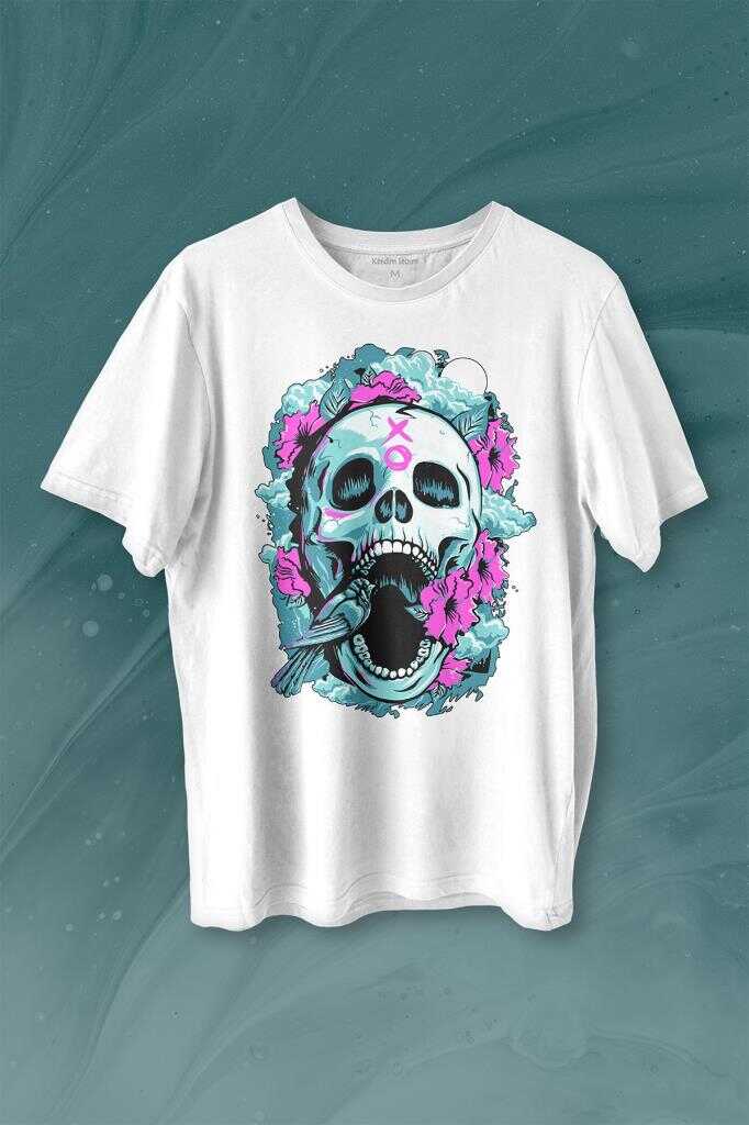 Sugar Skull Skeleton Rose Kuru Kafa Gül Baskılı Tişört Unisex T-shirt