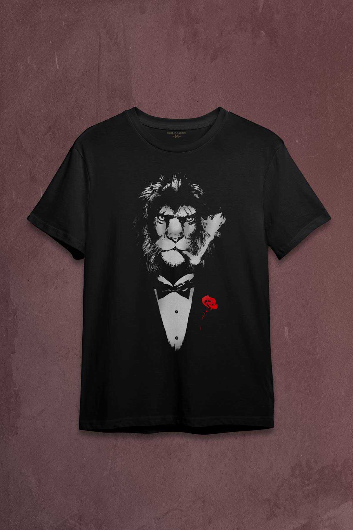 Suit Lion Aslan Takım Elbiseli ve Gül Rose Baskılı Tişört Unisex T-shirt