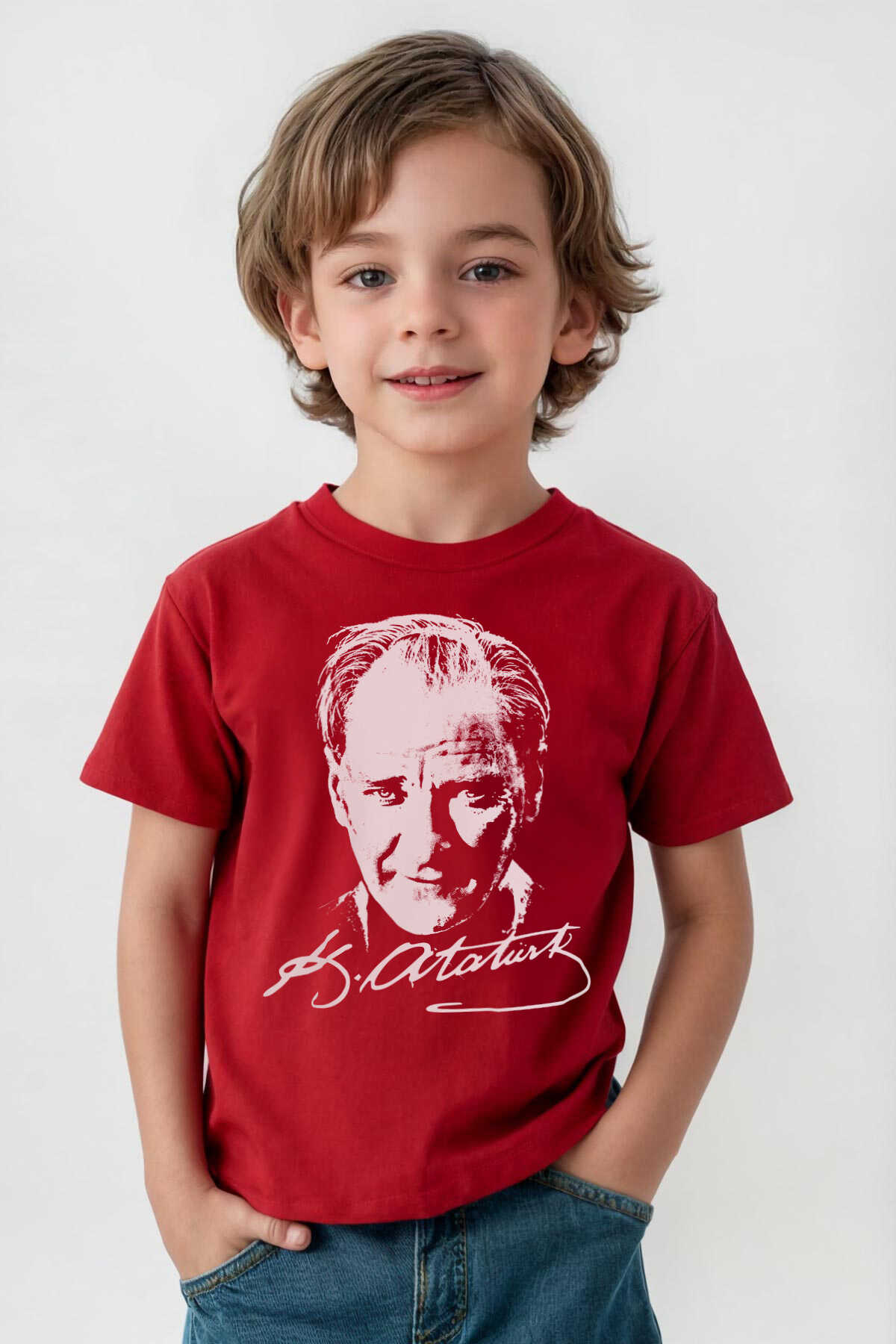 Unisex Kırmızı Mustafa Kemal Atatürk 23 Nisan & 19 Mayıs Baskılı Çocuk Tişört - T03K-1839