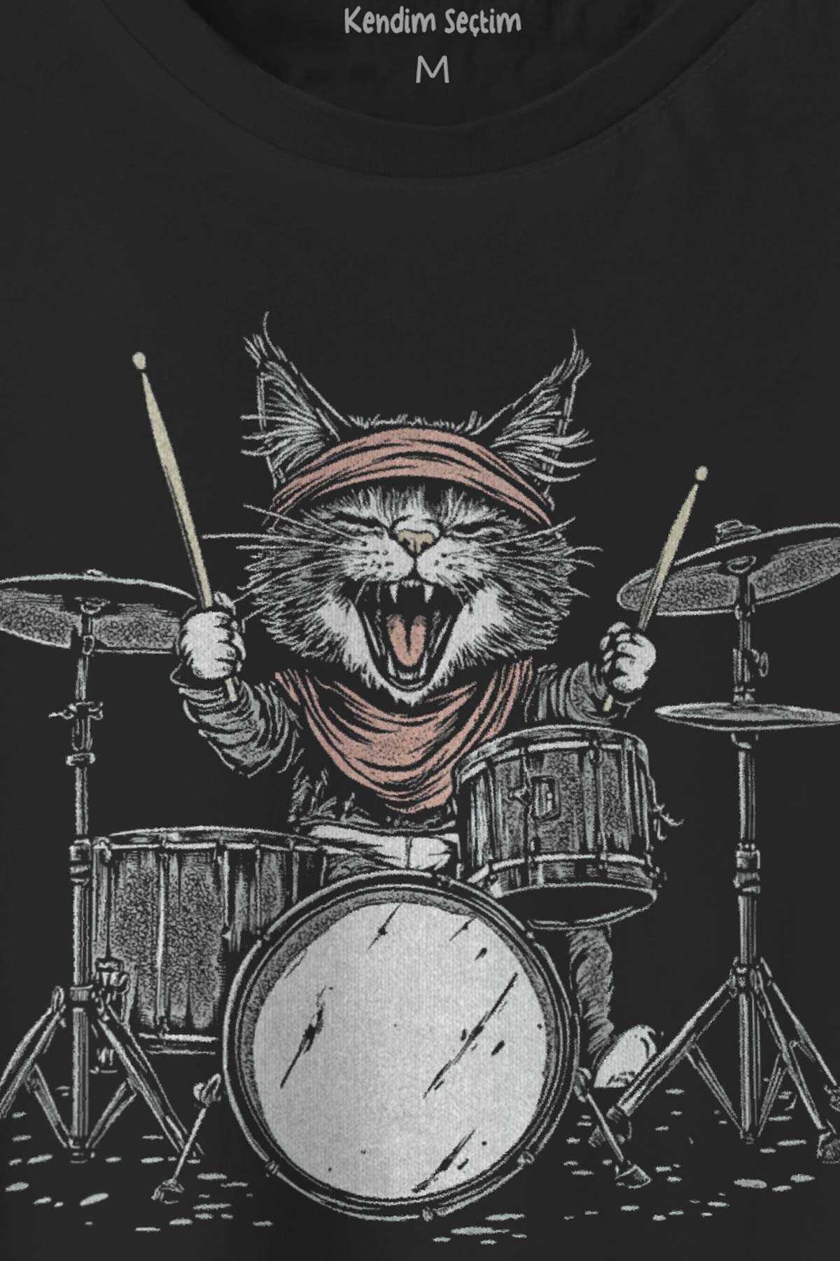 Unisex T-shirt Drummer Cat Kedi Davulcu Müzik Music Drum Cute Baskılı Siyah Tişört