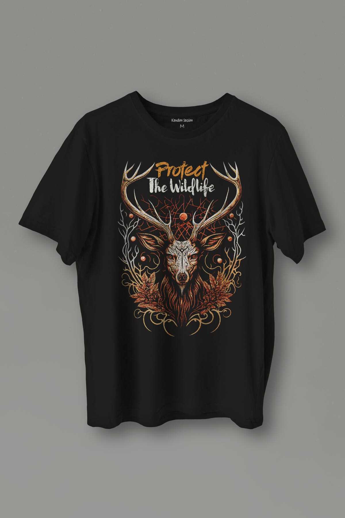 Unisex T-shirt Protect The Wildlife The Deer Nature Outdoor Doğa Geyik Siyah Baskılı Tişört