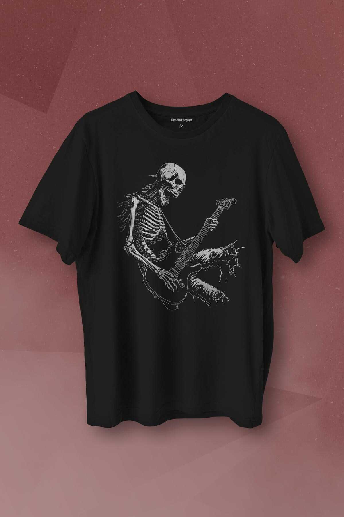 Unisex T-shirt Skeleton Playing Guitar Heavy Metal Skull İskelet Gitar Rock Siyah Baskılı Tişört